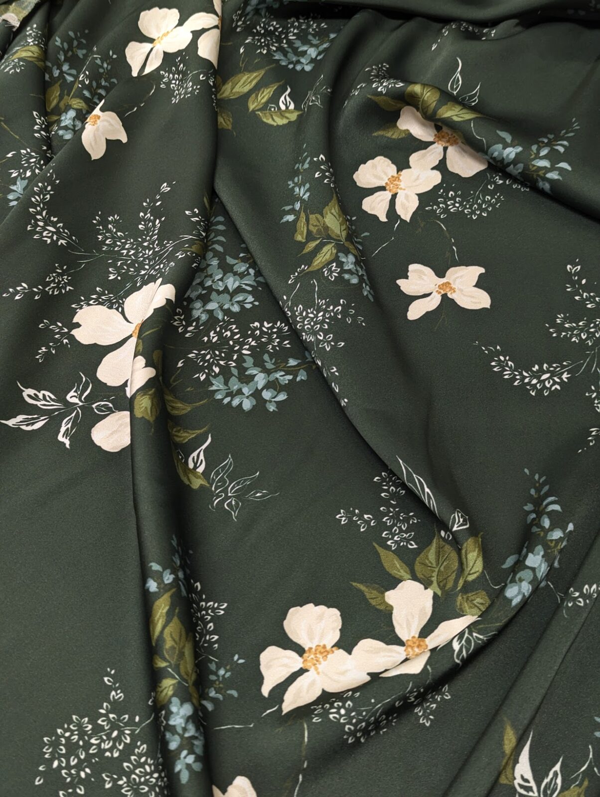 Light acetate fabric with a floral print in green and pink. Smooth touch, subtle sheen.