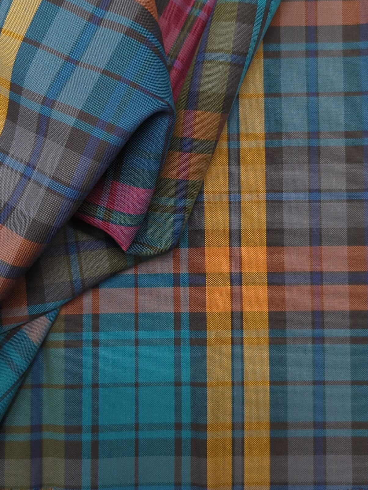 Smooth cotton shirting with a uniform structure. The green and mustard check pattern provides contrast while maintaining a clean, controlled surface.