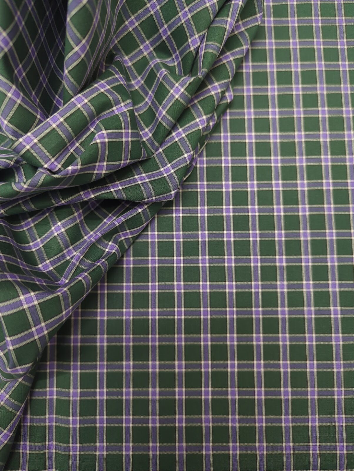 Cotton shirting fabric with a smooth finish and uniform structure. The green and purple checks create contrast while maintaining a clean, controlled surface.