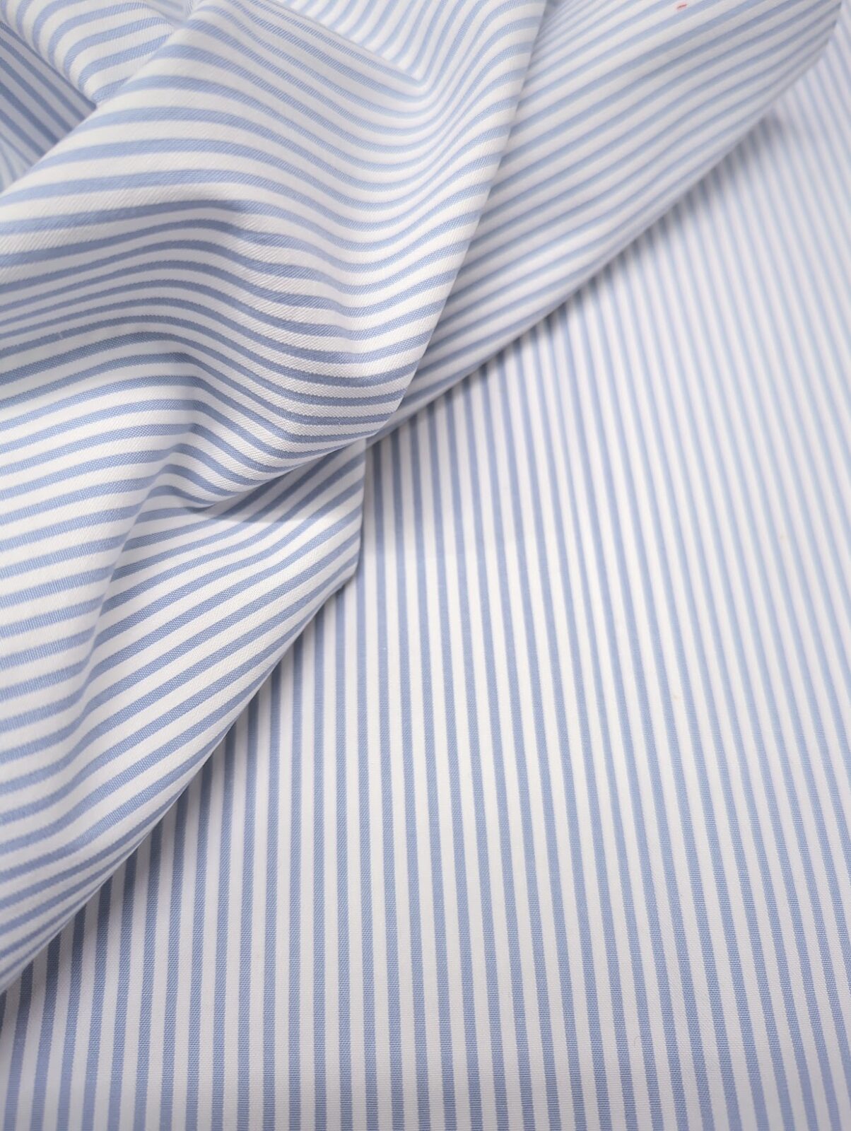 Cotton shirting fabric woven with blue and white stripes. The surface is clean and smooth, with a stable structure and consistent stripe definition.