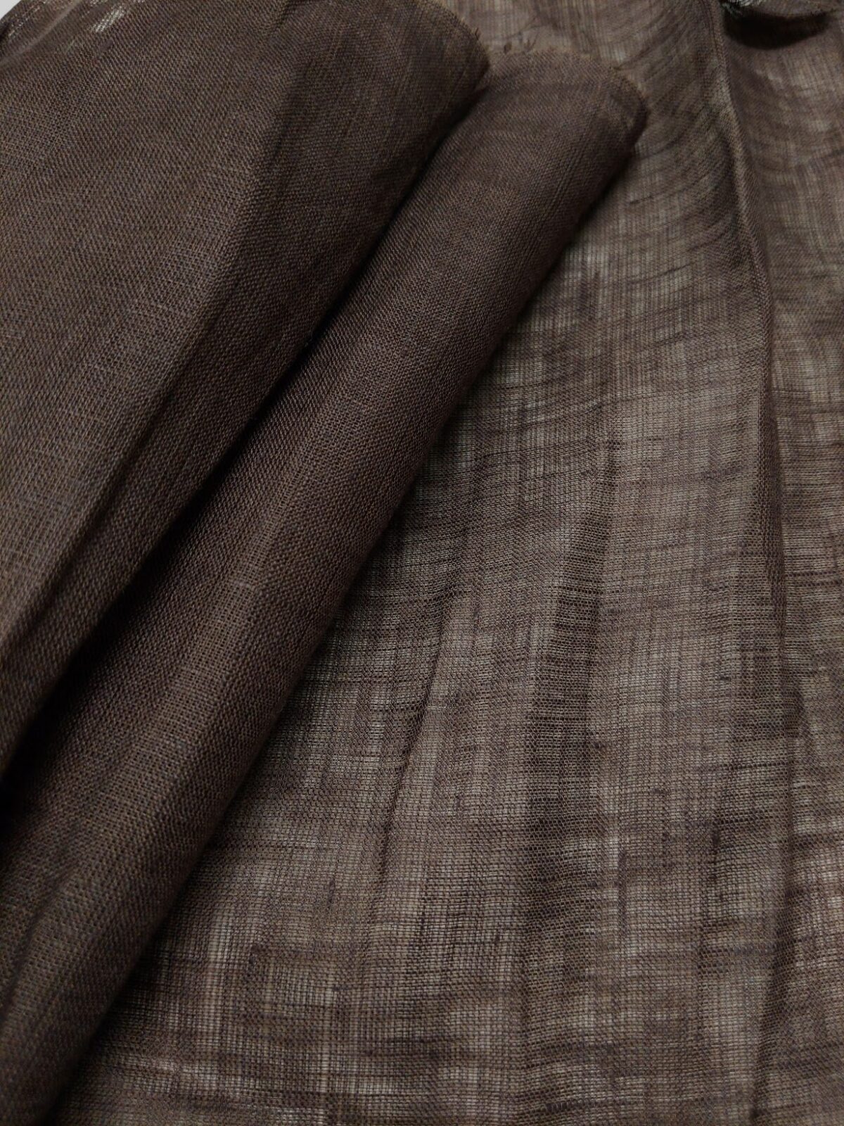 This lightweight, semi-sheer deadstock linen features a rich chocolate brown hue with a washed finish that softens both the color and handfeel. Its breathable weave and fluid drape make it ideal for summer layering pieces, such as relaxed shirts, oversized tunics, or resort wear.