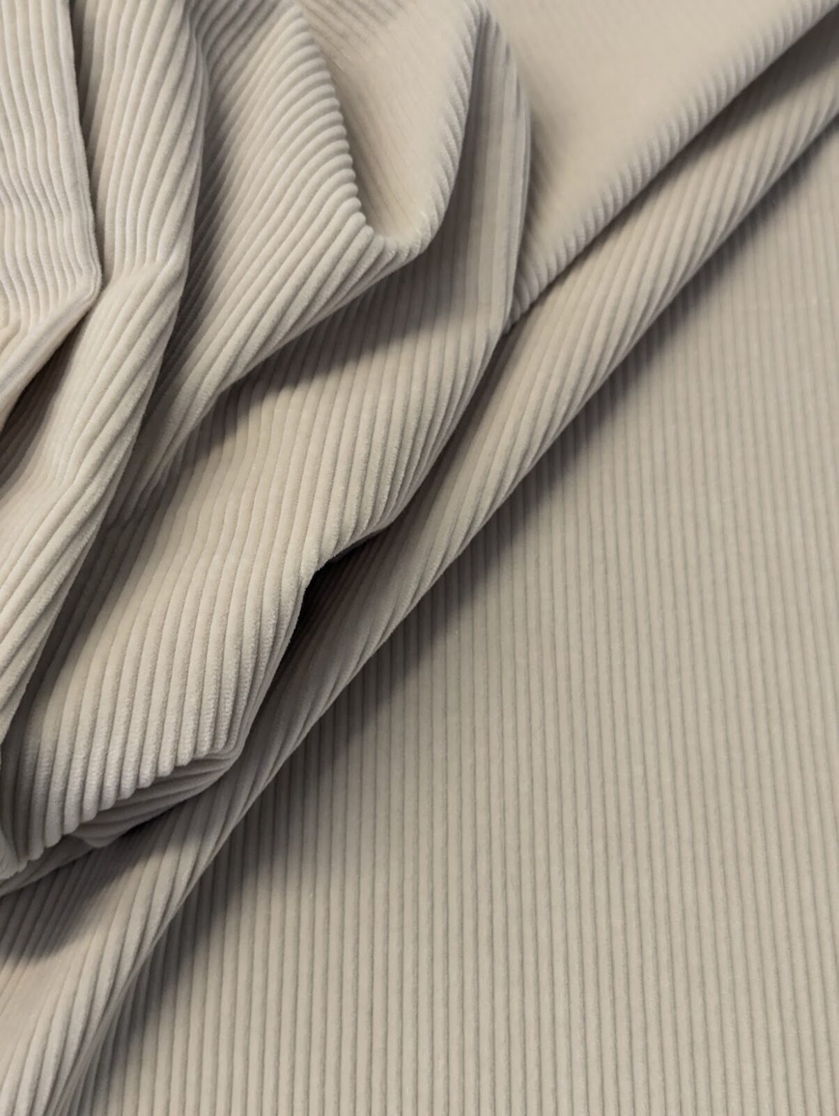 Midweight corduroy in soft beige shade. Compact weave with fine ribs and natural softness.