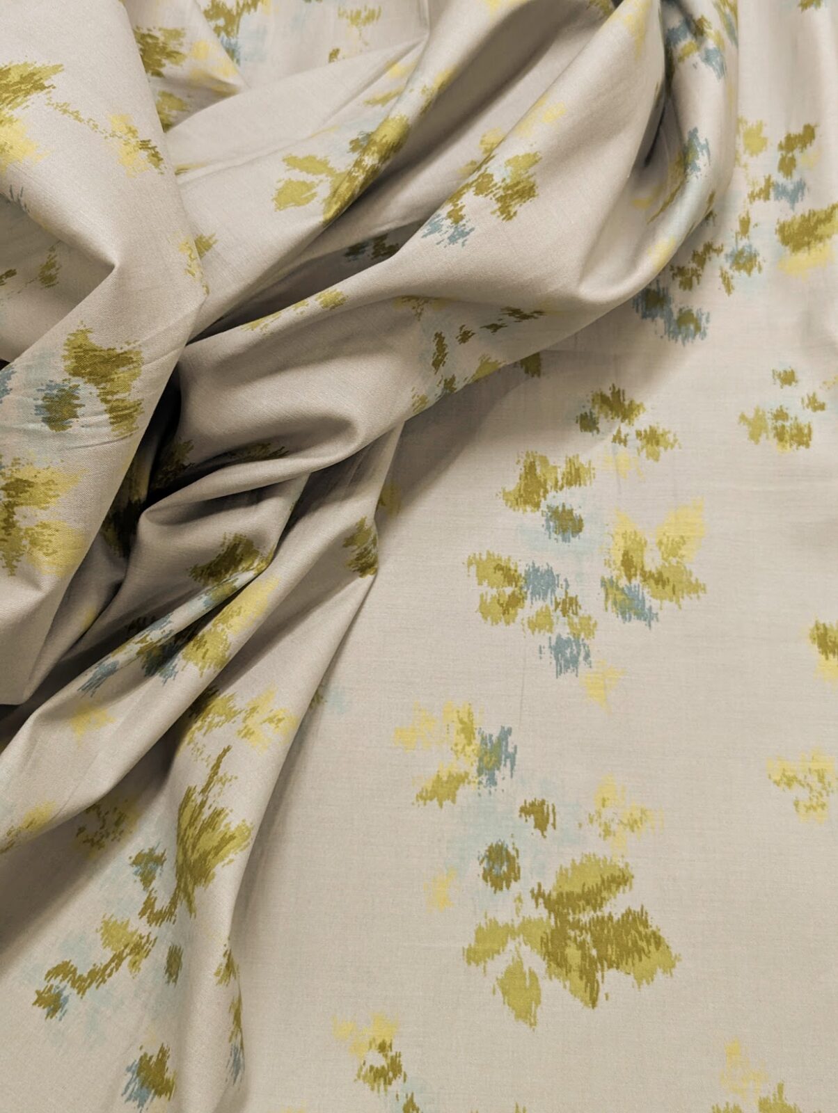 Light plain-weave cotton with yellow floral design on a beige ground.