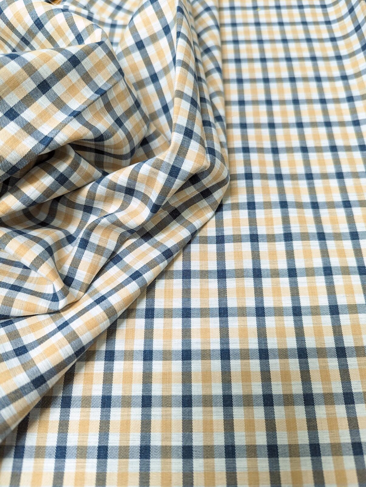 Soft cotton flannel in a blue and yellow plaid pattern. Warm and cozy, perfect for shirts, dresses, and casual jackets.