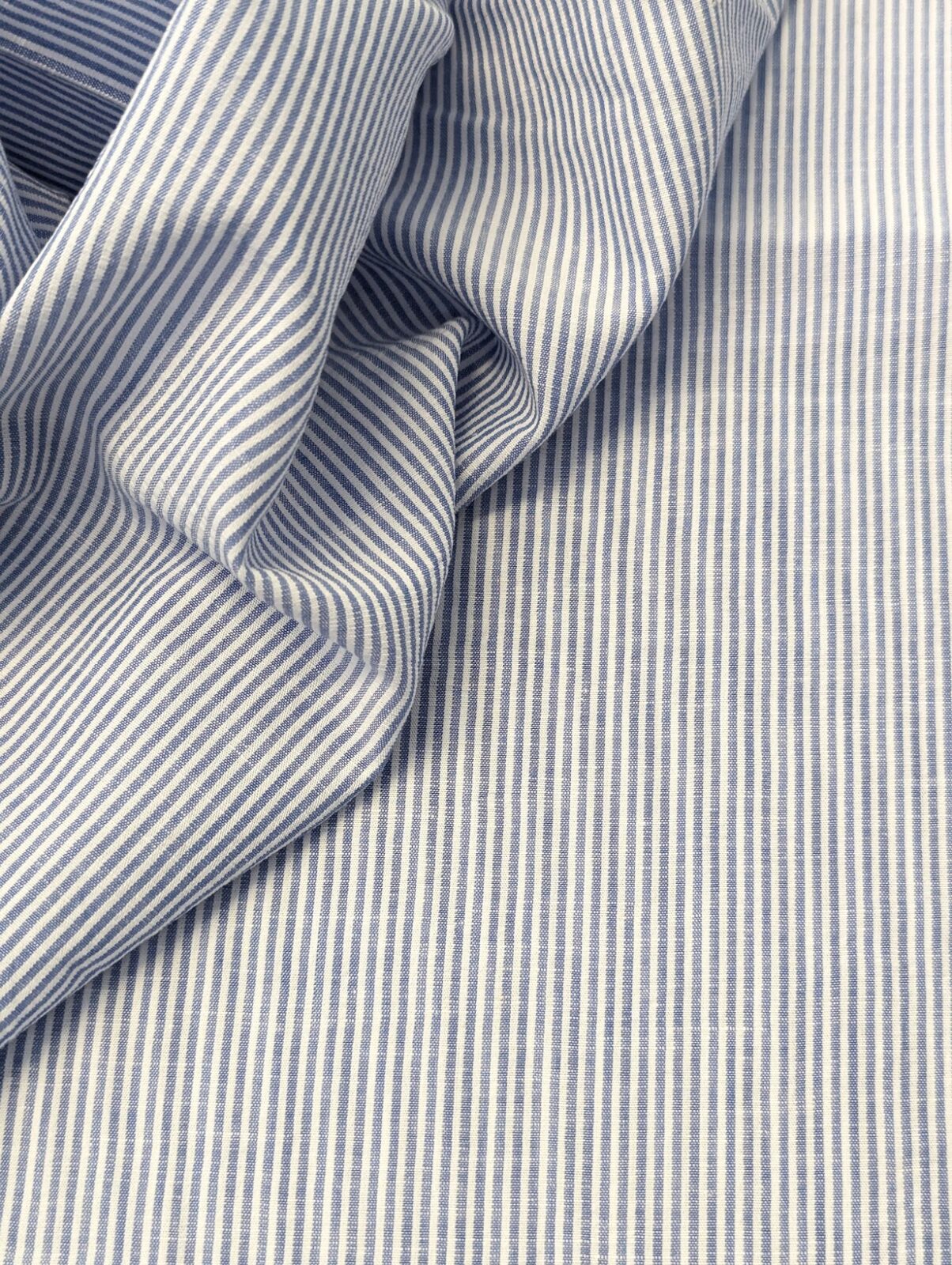 Extra-light plain-weave cotton–linen blend in white and blue stripes. Crisp handfeel, breathable texture, and refined appearance.