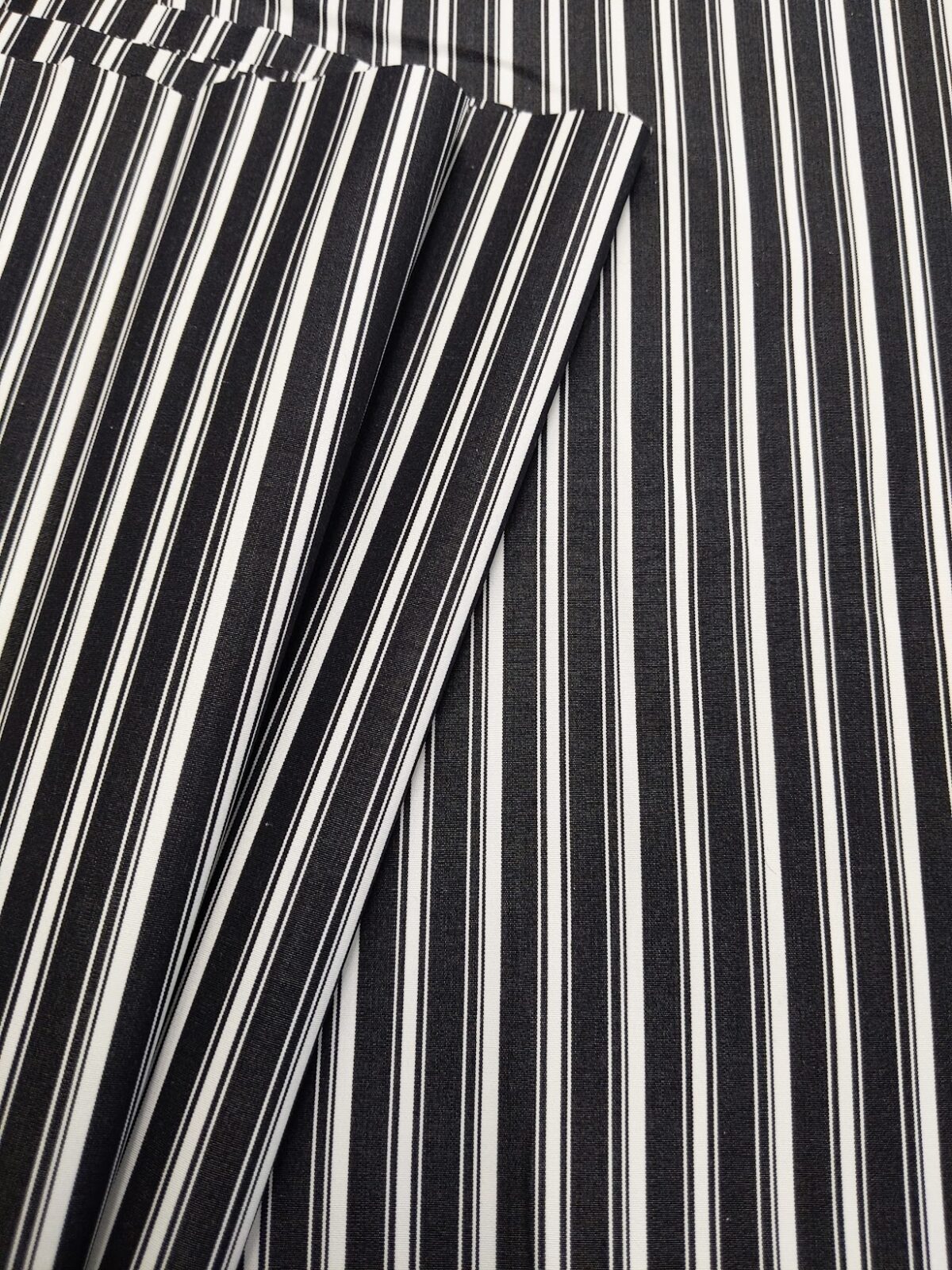 Classic cotton shirting fabric with crisp black and white stripes. Breathable and comfortable, it is ideal for tailored shirts, blouses, and lightweight summer dresses.