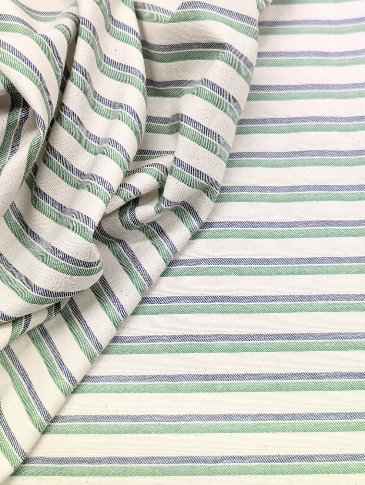 Cotton twill with diagonal weave and striped pattern in green and blue. Smooth handle, durable structure.