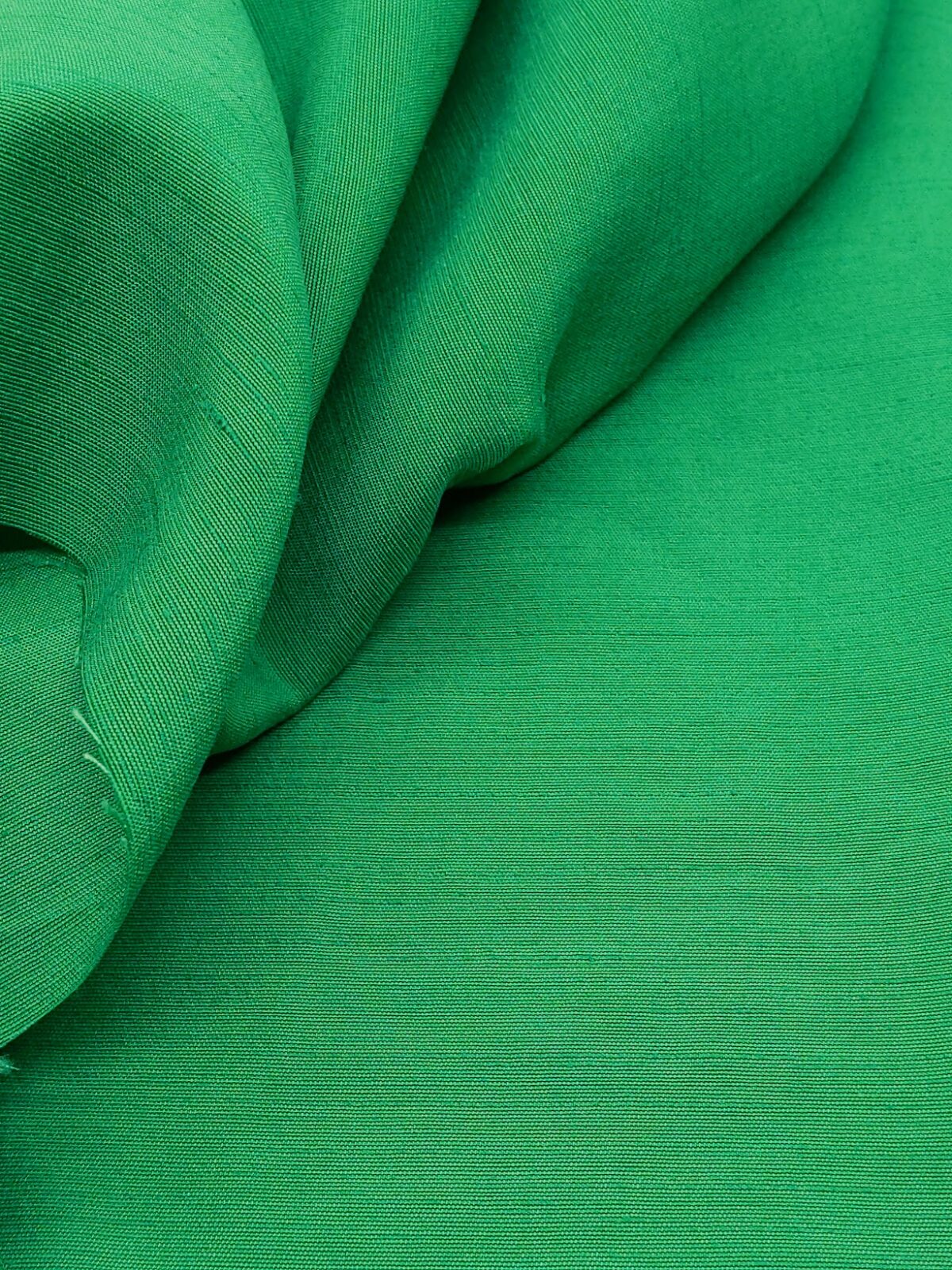 A vibrant deadstock linen in a saturated emerald green hue, woven in a fine twill pattern that adds a subtle directional texture. With a dry, crisp hand and moderate body, this fabric lends itself well to statement shirting, summer suits, or tailored separates.