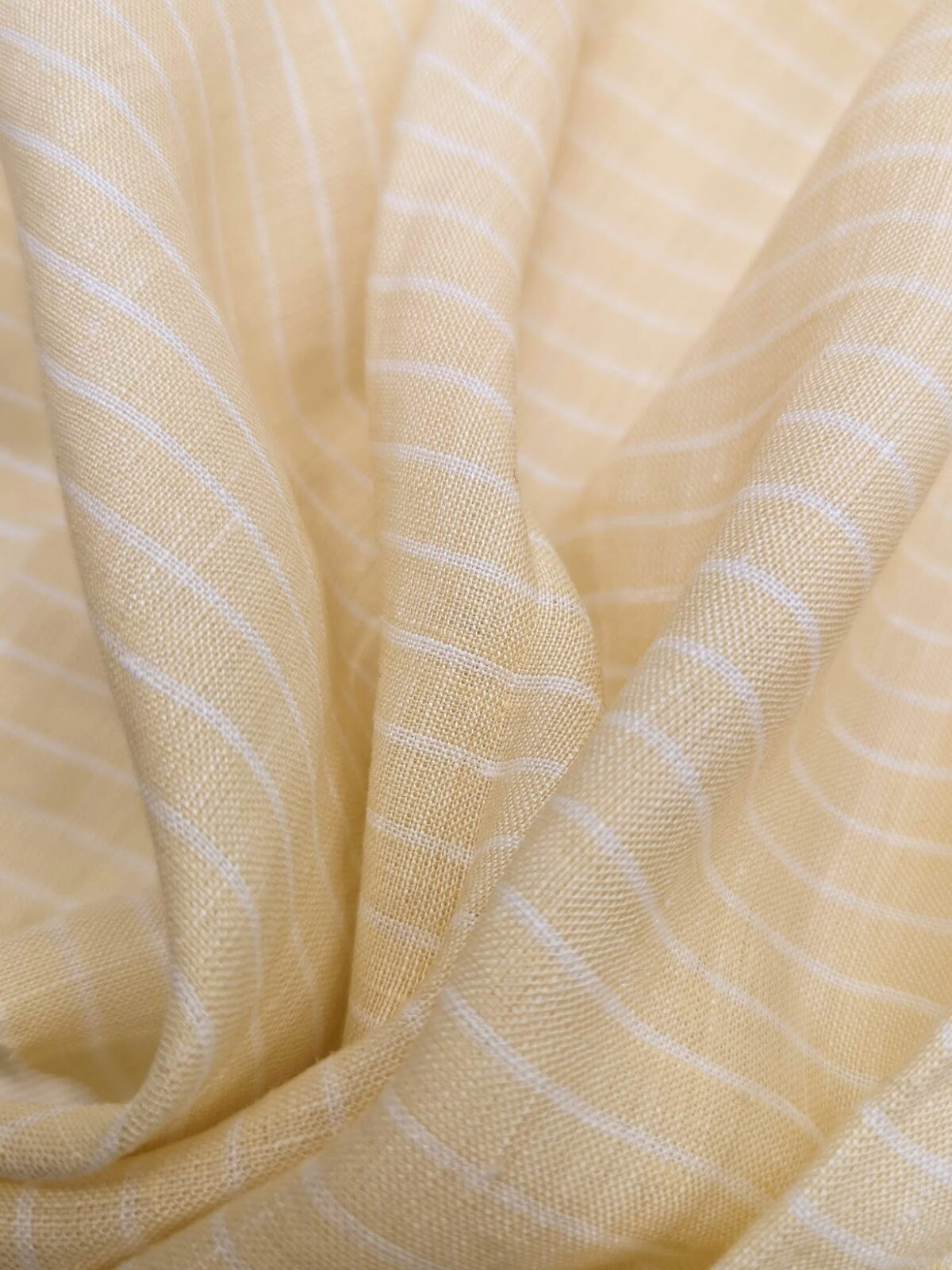 Fresh plain-weave linen with cheerful yellow and white stripes. Lightweight and airy, ideal for summer wear and beach outfits.