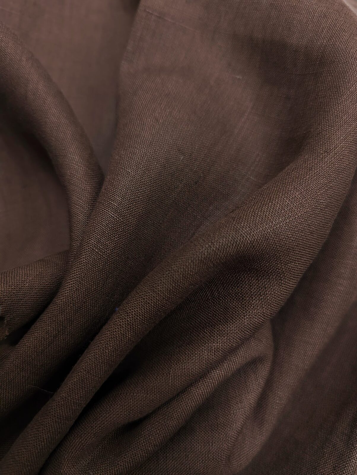 Structured plain weave linen in a rich chocolate shade. Perfect for tailored suits, trousers, jackets, and dresses.