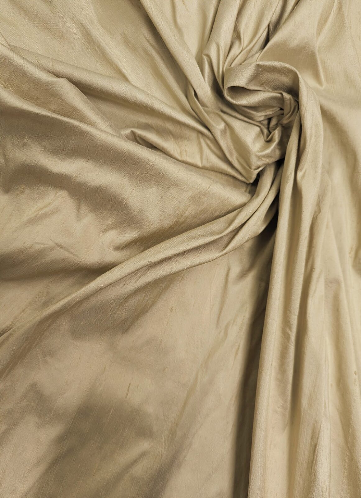 Raw silk fabric in gold tone with natural slubs and irregular texture.