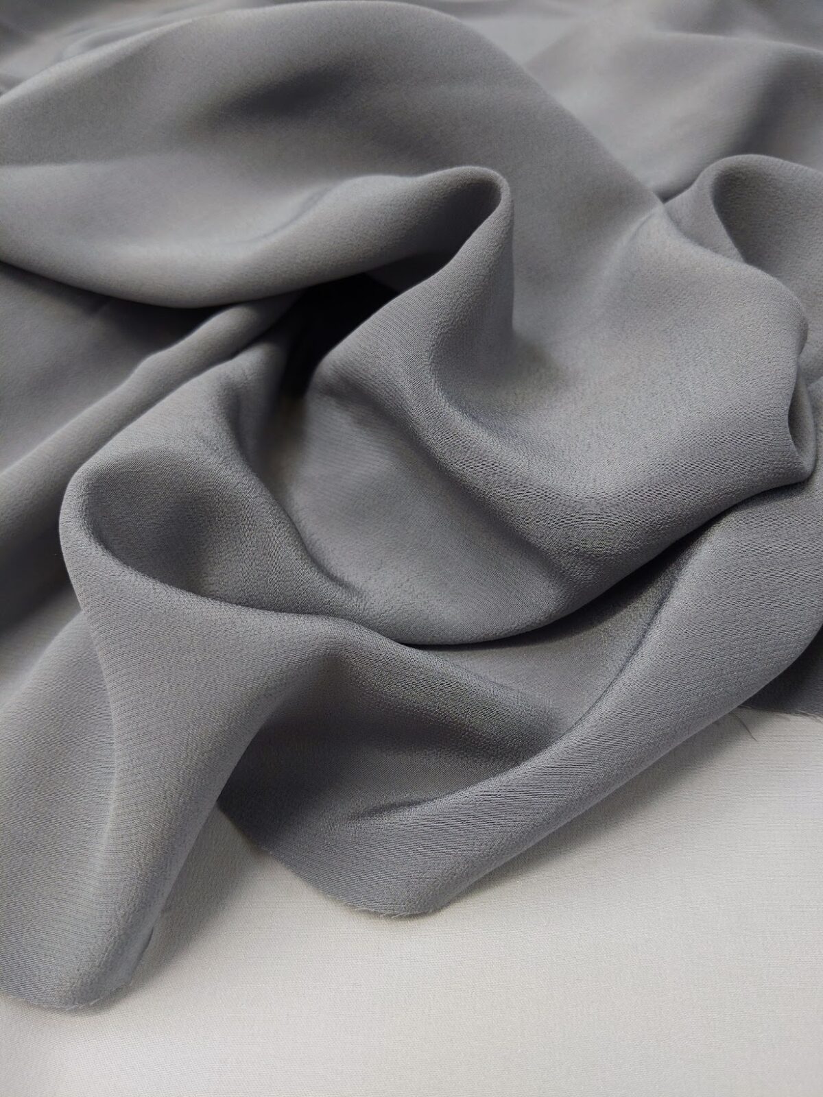 Refined silk crepe de Chine in a versatile mid-grey. With its subtle matte surface and fluid drape, this fabric is an excellent choice for elegant blouses, day-to-evening dresses, and refined separates.