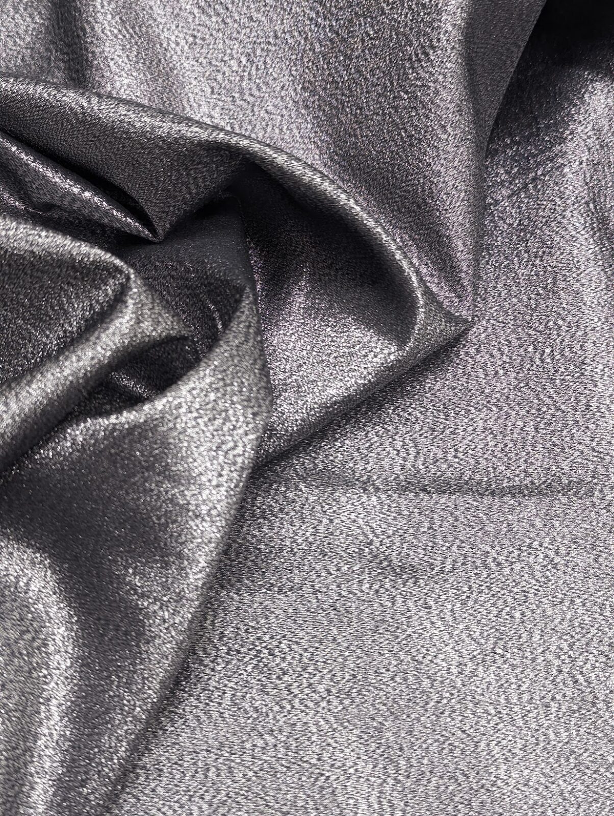 Silk base with integrated silver lurex yarns. Smooth surface with subtle sparkle and controlled drape.