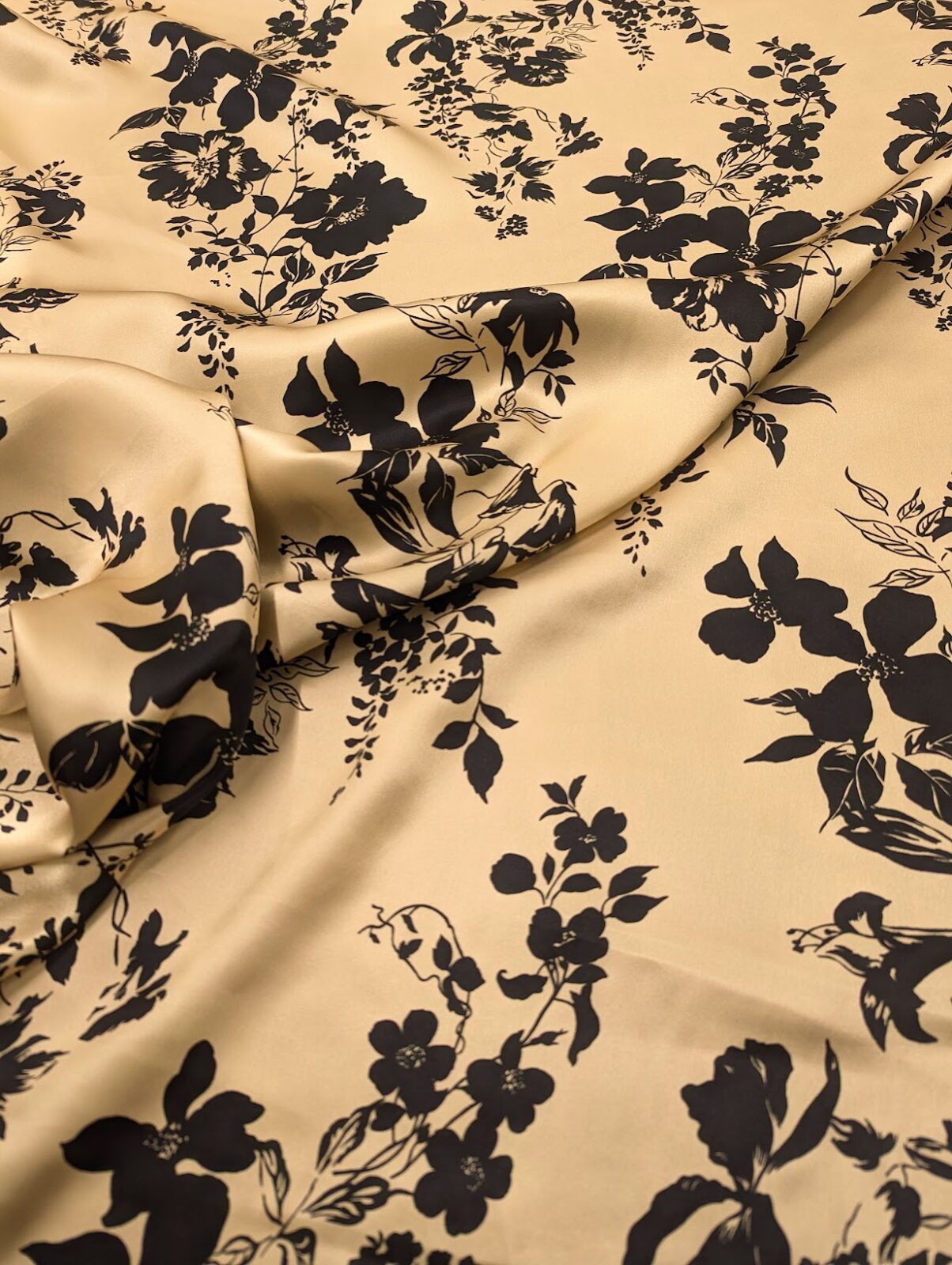 Pure silk with beige base and black floral design. Soft, fluid texture with refined natural shine.