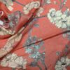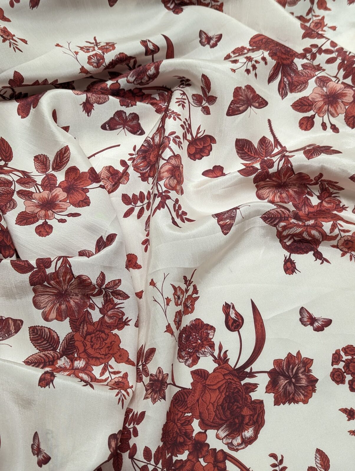 Silk satin with a floral print in red and white. Smooth, lustrous surface with even coloration and fluid movement.