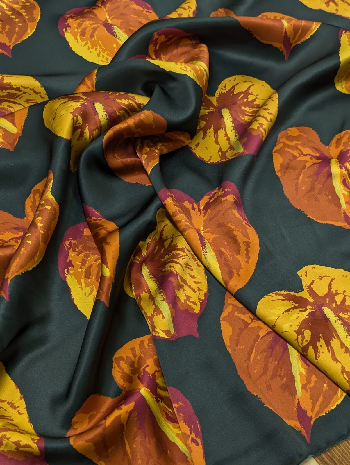 Medium-weight plain-weave silk in green and orange tones with floral motifs. Smooth surface, elegant sheen