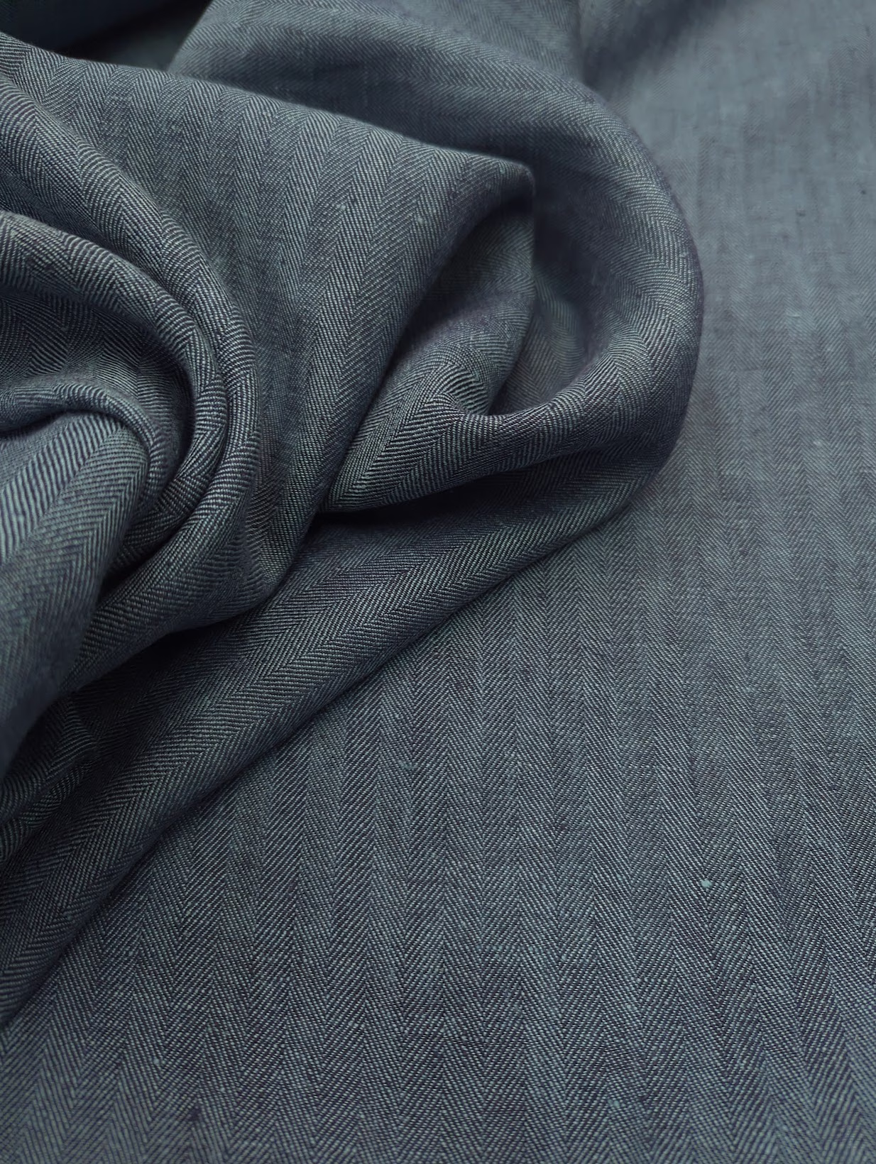 Linen suiting fabric woven in a herringbone structure with a petrol tone. The weave creates a defined, textured surface with a firm hand and breathable construction.