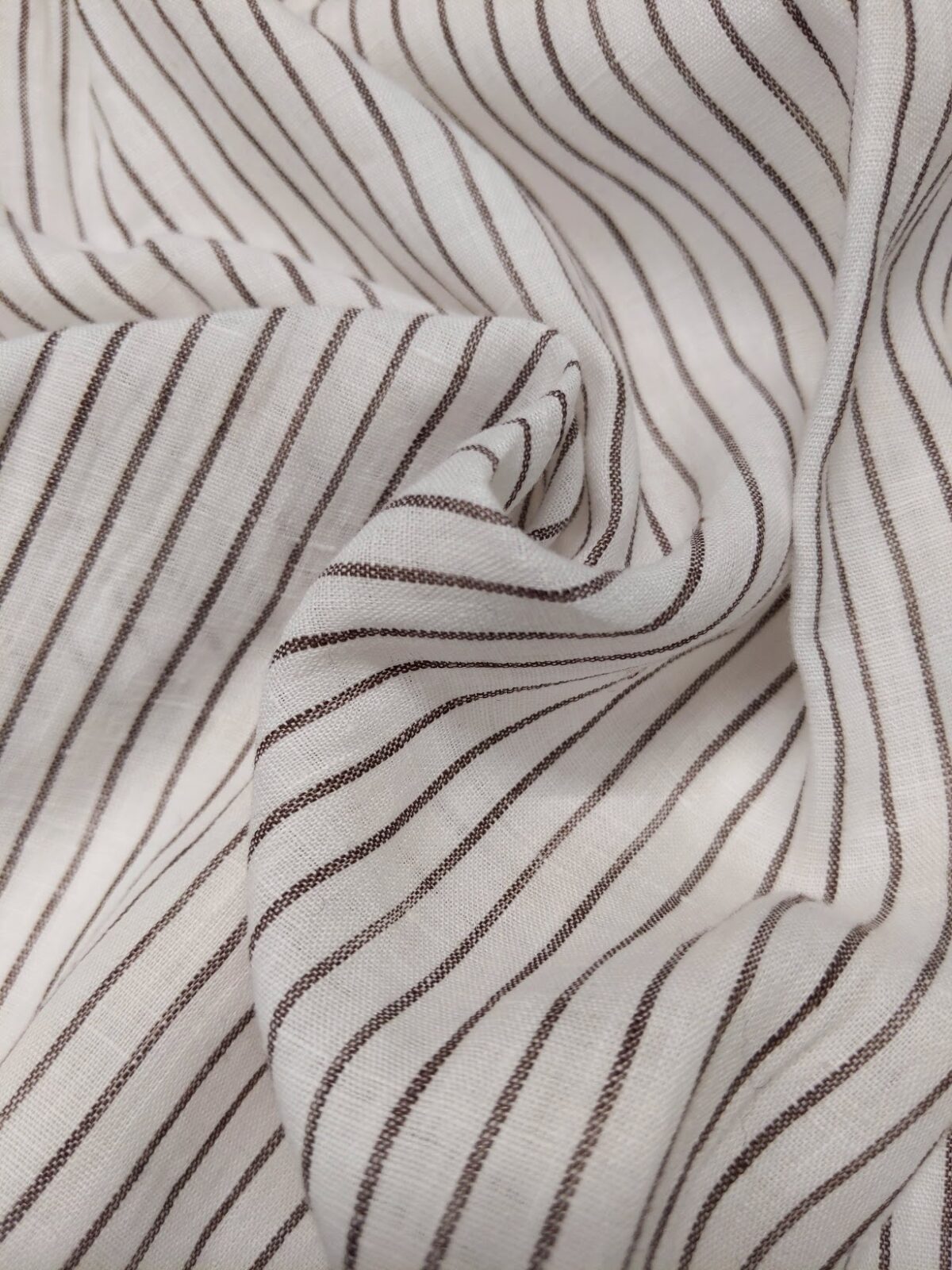 A classic deadstock yarn-dyed linen with an ivory base and fine cocoa brown pinstripes. This fabric combines structure with breathability, perfect for unstructured blazers, elevated shirts, or warm-weather trousers.
