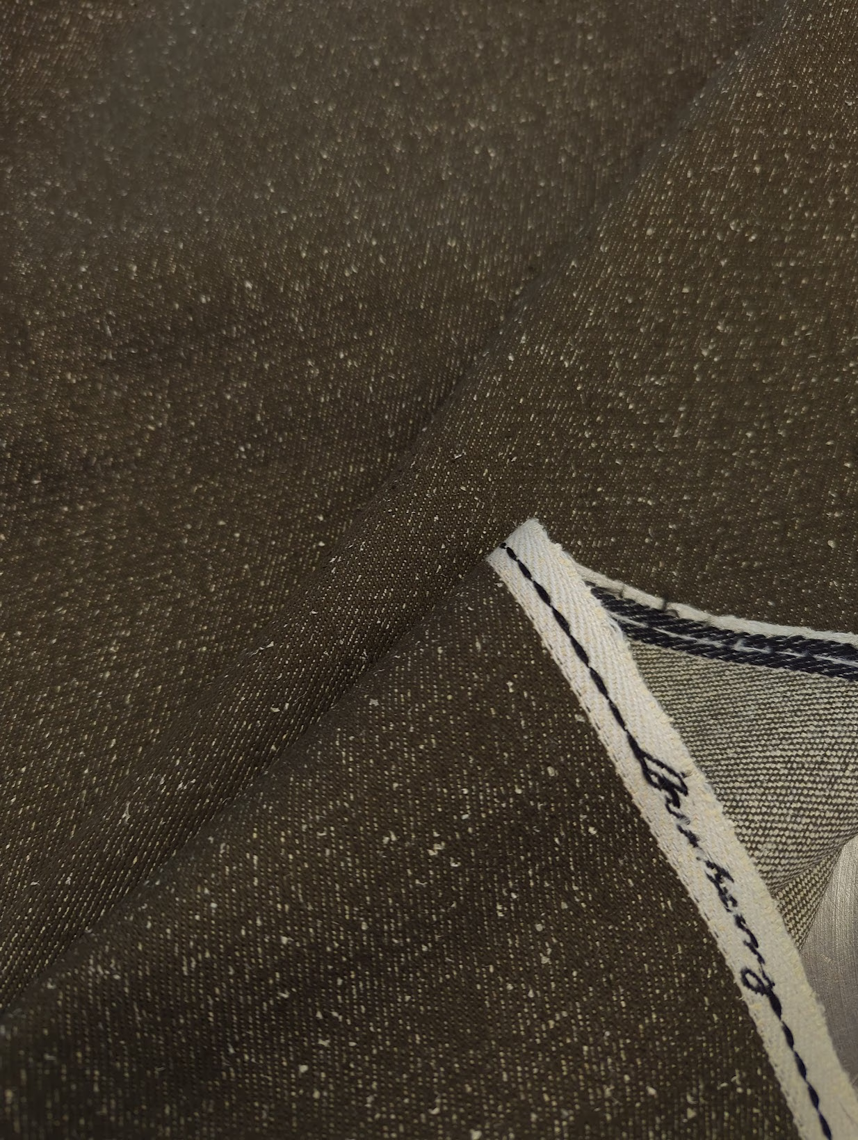 Japanese-made cotton blend denim in a tobacco green shade. The twill weave provides strength and character, with a slightly textured surface and refined, robust hand.