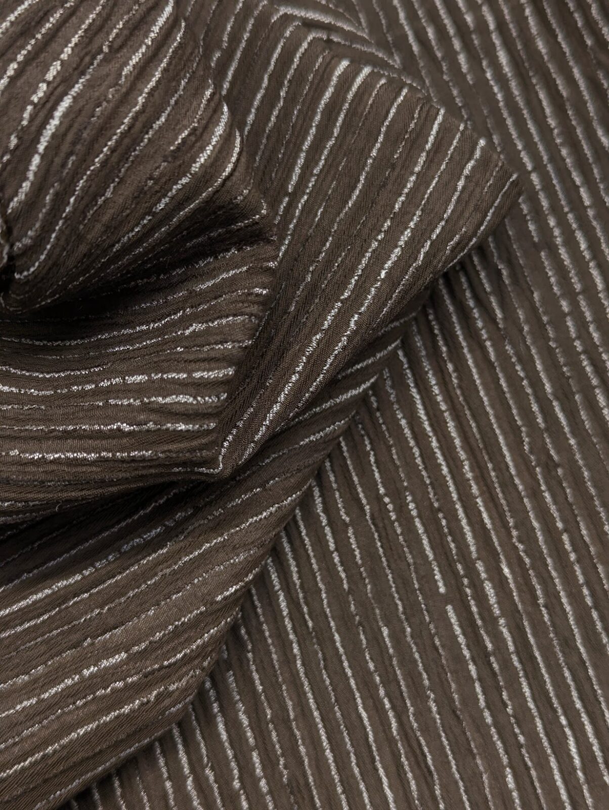 Brown jacquard wool blend with striped design. Firm texture and understated retro look.