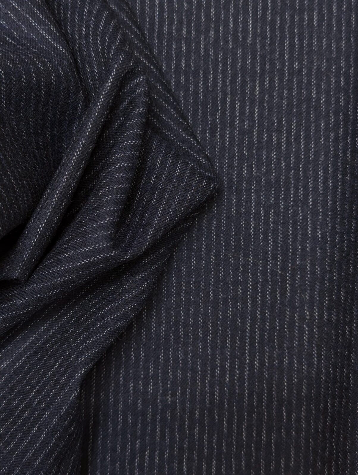 Navy wool (90%)–cotton (10%) blend with chalk stripes. Firm handle and vintage tailoring character.