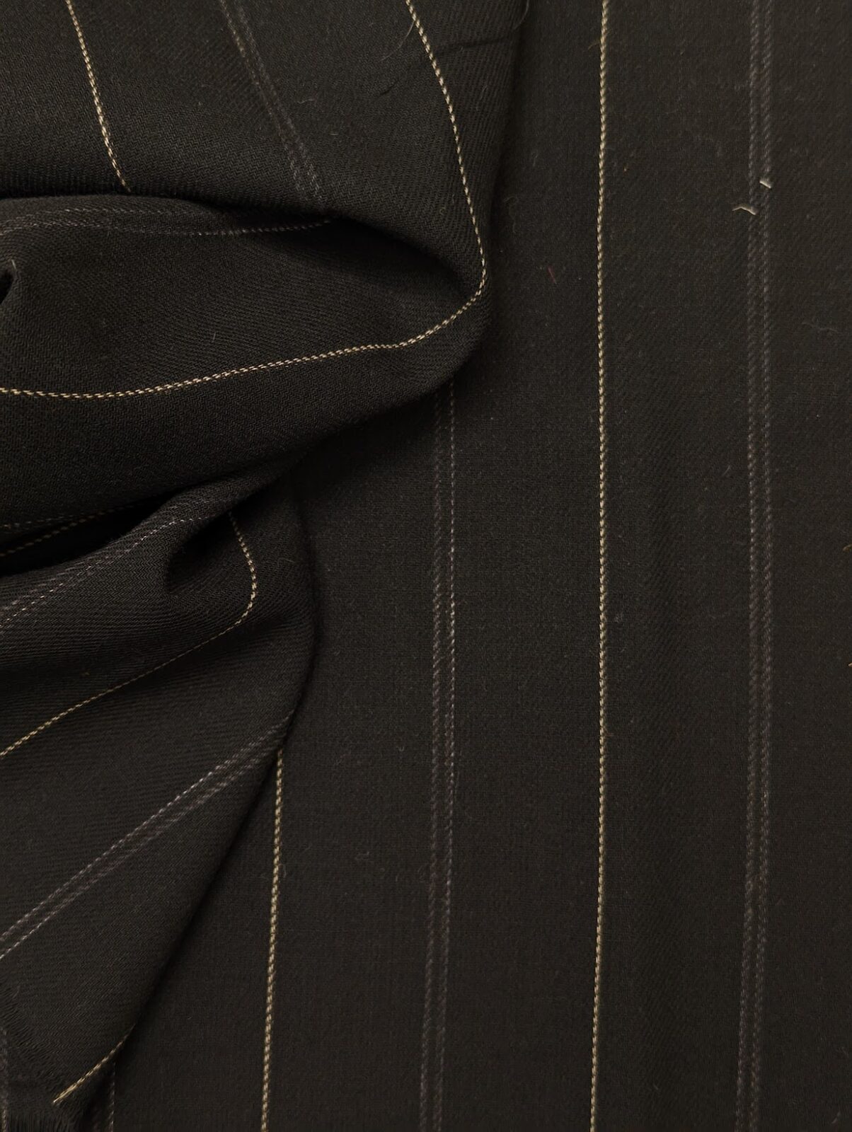 Black suiting wool with fine pinstripes. Compact weave and smooth hand, reflecting an old tailoring style.