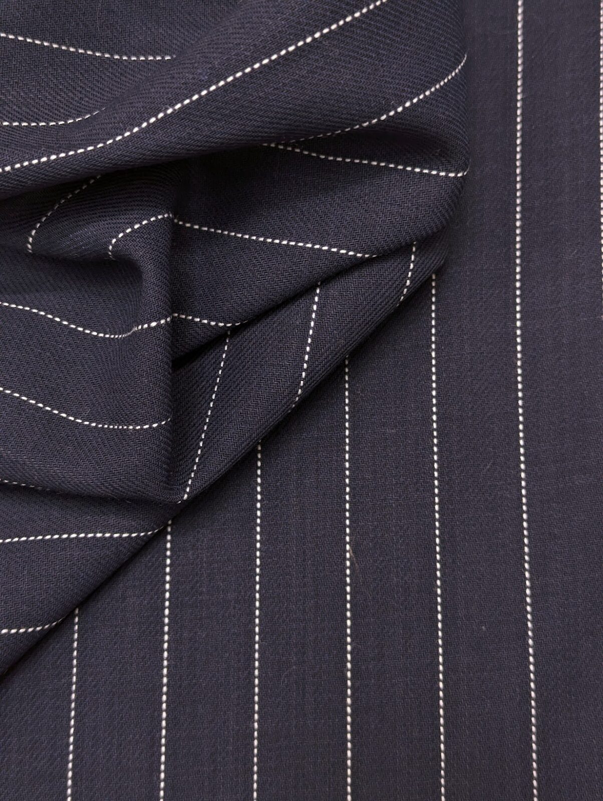 Navy pure wool suiting with fine pinstripes. Traditional vintage quality with a smooth hand.