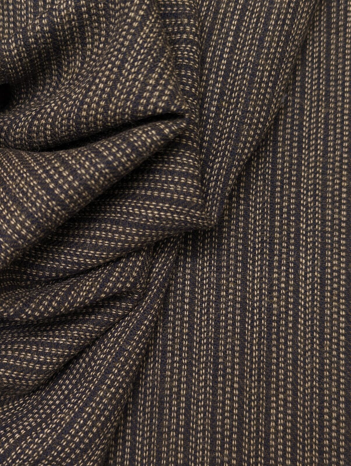 Dark brown suiting wool with woven stripes. Dense weave and restrained vintage appearance.