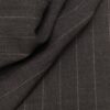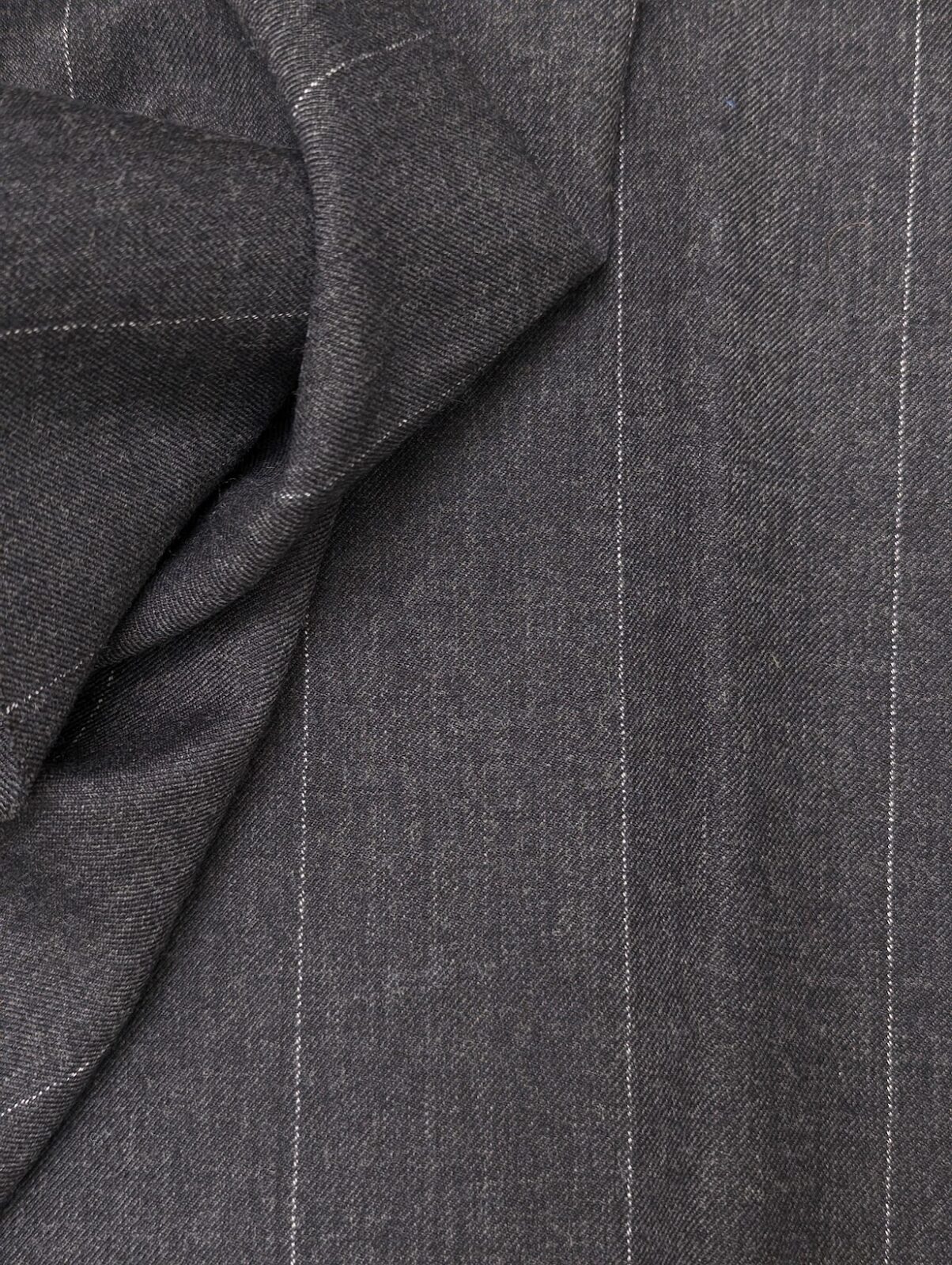 Dark grey wool with wide-spaced pinstripes. Defined texture, stable construction.