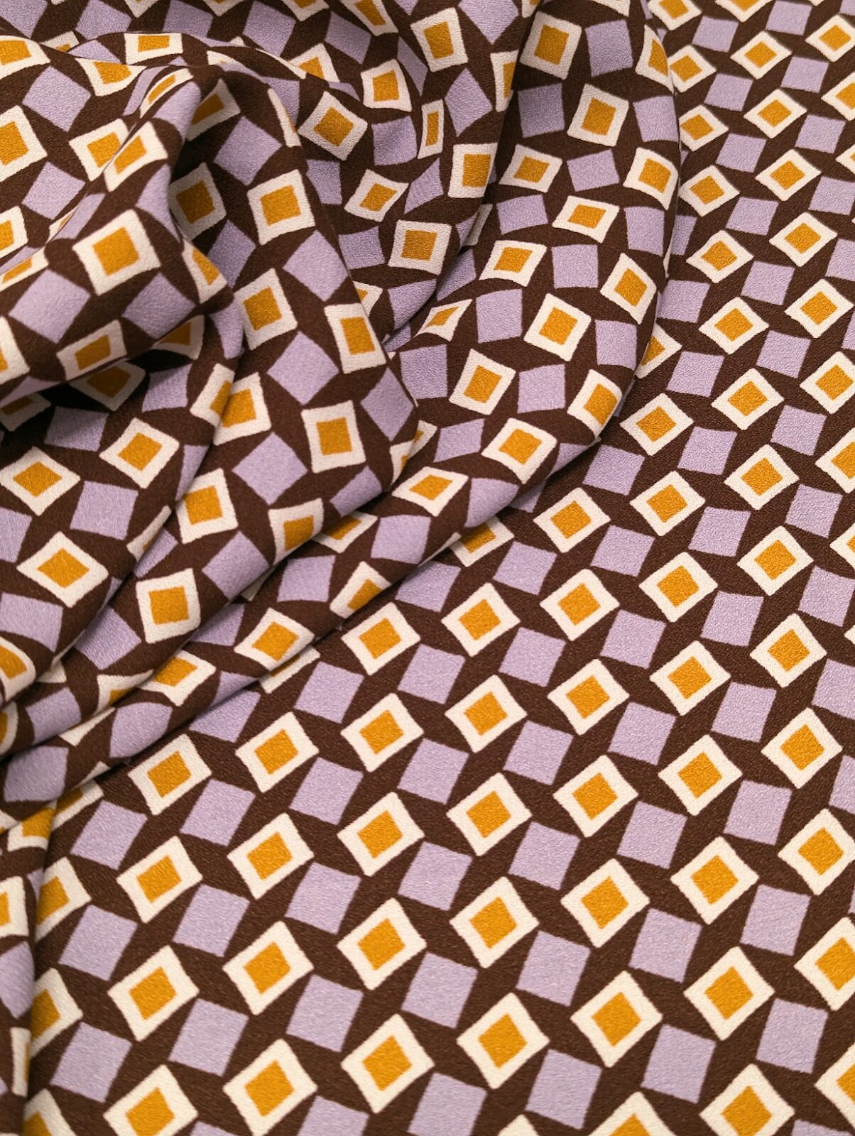 Viscose plain-weave fabric with a printed geometric pattern in brown, lilac, and mustard tones. Smooth touch with slight surface texture