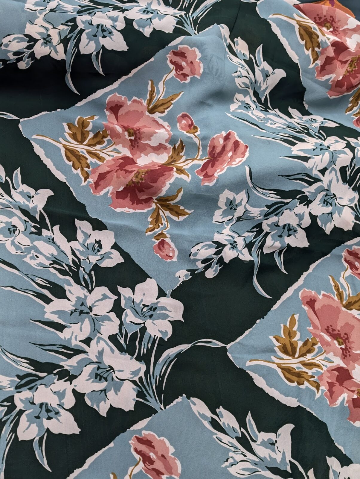 Soft, plain-weave viscose with a floral print in blue and pink hues. Lightweight and fluid